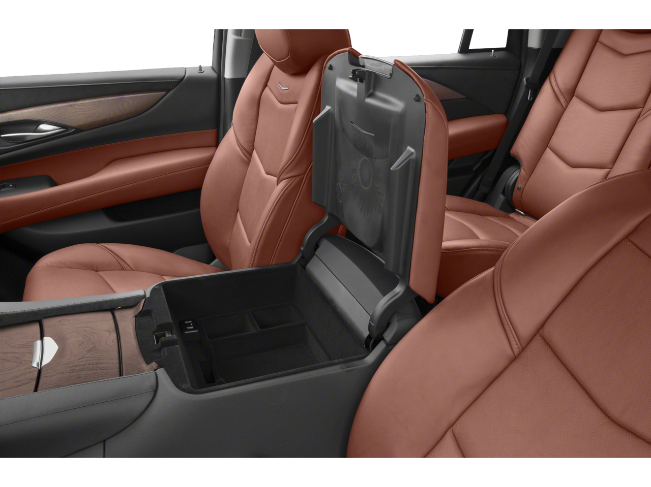 - Console, cooled with covered storage, large and small storage bins, dual cup holders, electronic climate controls and second row heated seat controls (inside console: auxiliary power outlet, two USB ports and auxiliary audio port), 110-volt outlet and auxiliary power outlet on the backside of console